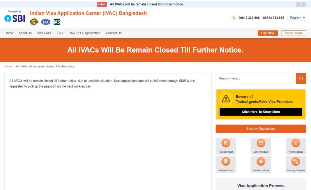 পরবর্তী নির্দেশনা না দেওয়া পর্যন্ত বাংলাদেশের সব ভারতীয় ভিসা সেন্টার (আইভিএসি) বন্ধ রাখার ঘোষণা দেয়া হয়েছে।