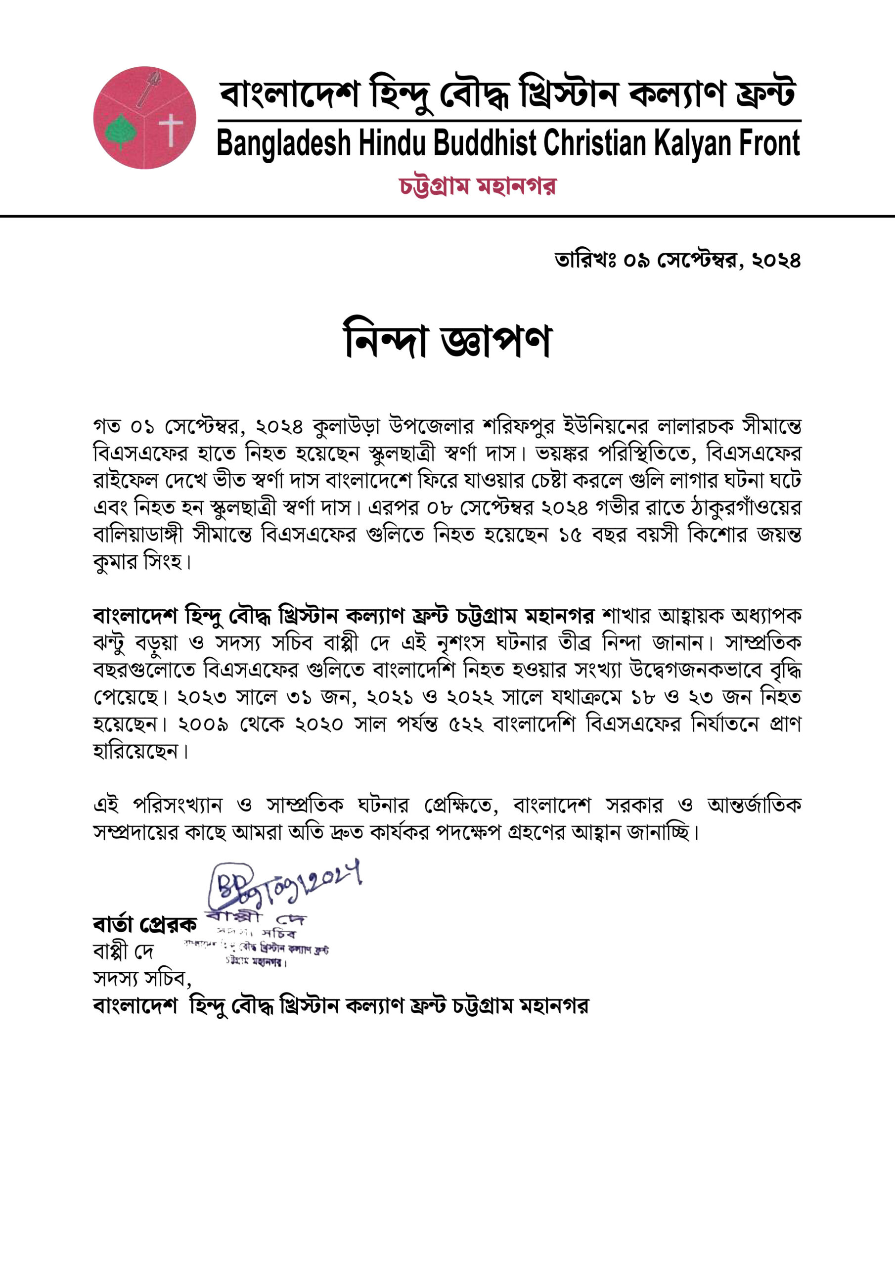 স্বর্ণা ও জয়ন্ত হত্যায় হিন্দু বৌদ্ধ খ্রিস্টান কল্যাণ ফ্রন্টের প্রতিবাদ