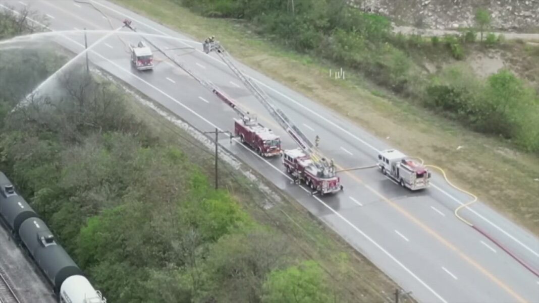 আকাশ থেকে ধারণ করা ভিডিওতে দেখা যায়, দমকলকর্মীরা রাস্তার পাশের একটি অ্যাসফল্ট কারখানার কাছে একটি রেলকারের উপর জল ছিটাচ্ছে। রেলকারটি সোজাভাবে ট্র্যাকে দাঁড়িয়ে ছিল, কিন্তু এর প্রেসার রিলিজ ভালভ থেকে স্টাইরিন নামে একটি বিষাক্ত ও দাহ্য রাসায়নিক লিক হচ্ছিল।